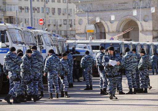 Russian special police gather in downtown Moscow, Russia, Sunday, May 26, 2017. Russia's leading opposition figure Alexei Navalny and his supporters aim to hold anti-corruption demonstrations throughout Russia. But authorities are denying permission and police have warned they won't be responsible for "negative consequences" or unsanctioned gatherings. (AP Photo/Alexander Zemlianichenko)
