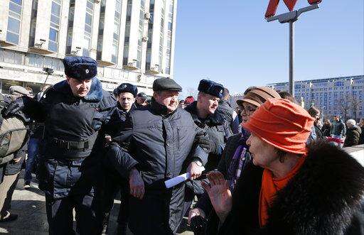 Police officer detains a protester in downtown Moscow, Russia, Sunday, March 26, 2017. Russia's leading opposition figure Alexei Navalny and his supporters aim to hold anti-corruption demonstrations throughout Russia. But authorities are denying permission and police have warned they won't be responsible for "negative consequences" or unsanctioned gatherings. (AP Photo/Alexander Zemlianichenko)