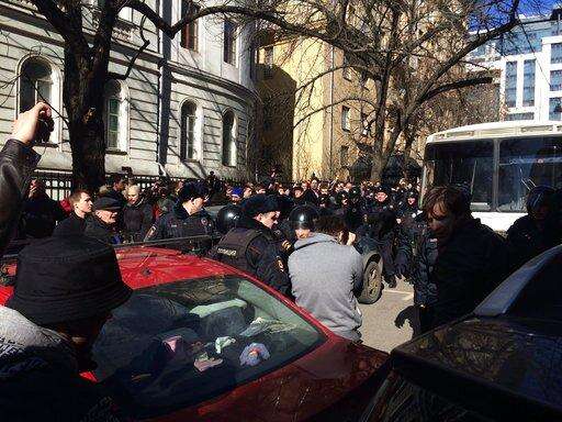 In this handout photo provided by Kira Yarmysh, Alexei Navalny press secretary, people block the way for police bus, where Alexei Navalny is kept in downtown Moscow, Russia, Sunday, March 26, 2017. Russia's leading opposition figure Alexei Navalny and his supporters aim to hold anti-corruption demonstrations throughout Russia. But authorities are denying permission and police have warned they won't be responsible for "negative consequences" or unsanctioned gatherings. (FBK.Info photo via AP)