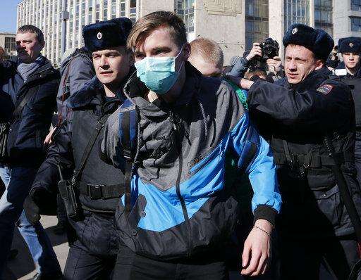 In this photo provided by Evgeny Feldman, Alexei Navalny is detained by police in downtown Moscow, Russia, Sunday, March 26, 2017. Russia's leading opposition figure Alexei Navalny and his supporters aim to hold anti-corruption demonstrations throughout Russia. But authorities are denying permission and police have warned they won't be responsible for "negative consequences" or unsanctioned gatherings. (Evgeny Feldman for Alexey Navalny's campaign photo via AP) MANDATORY CREDIT