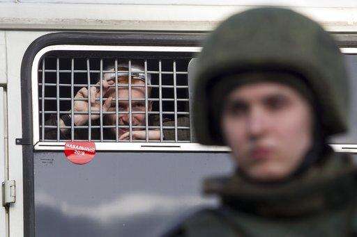 A detained protester looks out of a police bus window with a red sticker reading "Navalny" in downtown Moscow, Russia, Sunday, March 26, 2017. Russia's leading opposition figure Alexei Navalny and his supporters aim to hold anti-corruption demonstrations throughout Russia. But authorities are denying permission and police have warned they won't be responsible for "negative consequences" or unsanctioned gatherings. (AP Photo/Denis Tyrin)