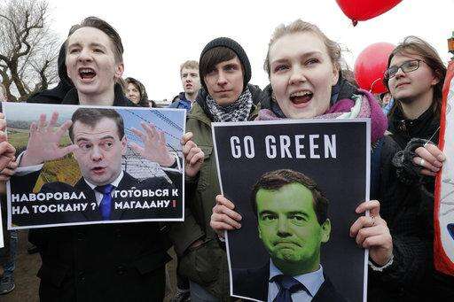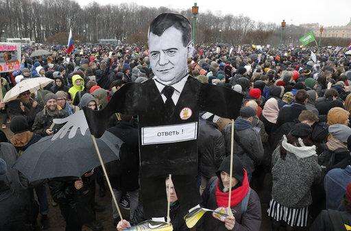 Protesters hold a cardboard cutout poster depicting Russian Prime Minister Dmitry Medvedev at Marsivo Field in St.Petersburg, Russia, Sunday, March 26, 2017. Thousands of people crowded in St.Petersburg on Sunday for an unsanctioned protest against the Russian government, the biggest gathering in a wave of nationwide protests that were the most extensive show of defiance in years. (AP Photo/Dmitri Lovetsky)