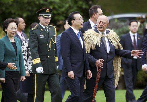Chinese Premier Li Keqiang, centre, walks with Maori elder Professor Piri Sciascia, right, at Government House in Wellington, New Zealand, Monday, March 27, 2017. Li is on a three-day visit to New Zealand for high-level talks at a time that both countries are pushing to expand free trade. (Mark Mitchell/NZ Herald via AP) The Associated Press