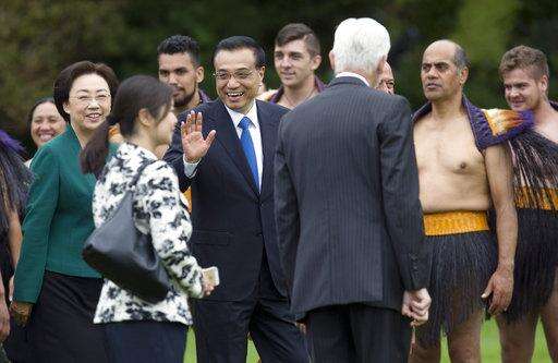 Chinese Premier Li Keqiang, center, walks with his wife Cheng Hong, left, as they arrive for an official welcoming ceremony at Government House in Wellington, New Zealand, Monday, March 27, 2017. Li is on three-day visit to New Zealand for high-level talks at a time that both countries are pushing to expand free trade. (Mark Mitchell/NZ Herald via AP) The Associated Press
