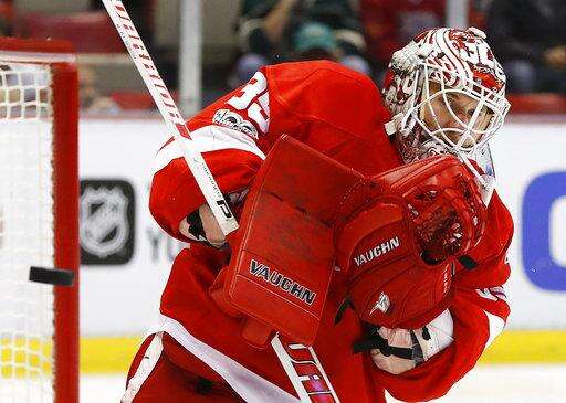 Detroit Red Wings goalie Jimmy Howard deflects a Minnesota Wild shot in the first period of an NHL hockey game Sunday, March 26, 2017, in Detroit. (AP Photo/Paul Sancya) The Associated Press