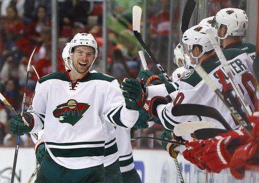 Minnesota Wild defenseman Nate Prosser celebrates his goal against the Detroit Red Wings in the second period of an NHL hockey game Sunday, March 26, 2017, in Detroit. (AP Photo/Paul Sancya) The Associated Press