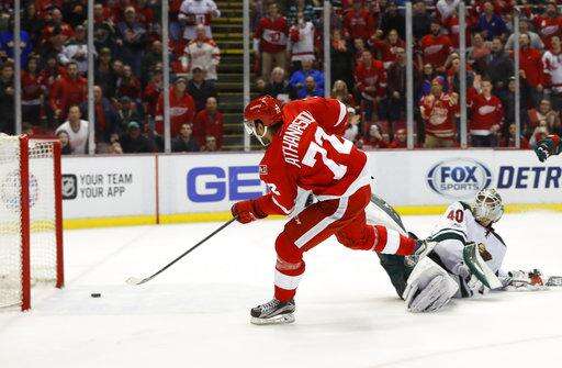 Detroit Red Wings center Andreas Athanasiou (72) scores on Minnesota Wild goalie Devan Dubnyk (40) in overtime during an NHL hockey game, Sunday, March 26, 2017, in Detroit. Detroit won 3-2. (AP Photo/Paul Sancya) The Associated Press
