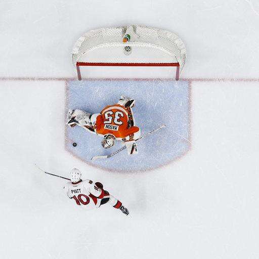 Philadelphia Flyers' Steve Mason, top, blocks a shot by Ottawa Senators' Tom Pyatt during a shootout in an NHL hockey game, Tuesday, March 28, 2017, in Philadelphia. Philadelphia won 3-2. (AP Photo/Matt Slocum) The Associated Press