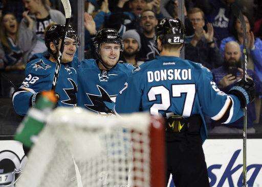 San Jose Sharks center Chris Tierney, center, celebrates his goal with teammates Timo Meier, left, and Joonas Donskoi (27) during the second period of an NHL hockey game against the New York Rangers Tuesday, March 28, 2017, in San Jose, Calif. (AP Photo/Marcio Jose Sanchez) The Associated Press