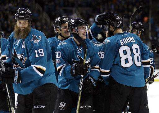 San Jose Sharks defenseman Brent Burns (88) celebrates his game-winning goal with teammates during overtime of an NHL hockey game against the New York Rangers Tuesday, March 28, 2017, in San Jose, Calif. (AP Photo/Marcio Jose Sanchez) The Associated Press