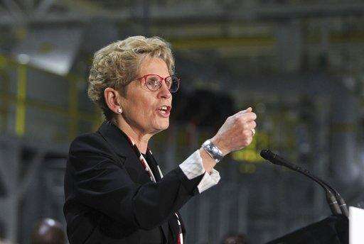Ontario Premier Kathleen Wynne speaks at the Ford Essex Engine Plant in Windsor, Ont. on Thursday, March 30, 2017. (Dave Chidley/The Canadian Press via AP) The Associated Press