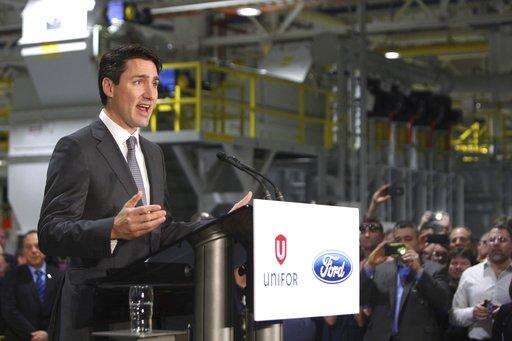 Canada's Prime Minister Justin Trudeau speaks at the Ford Essex Engine Plant in Windsor, Ontario, Canada, on Thursday, March 30, 2017. Ford Motor Co. is hiring more than 300 engineers for a new connected-vehicle research center in Ottawa, Ontario, the automaker said Thursday. (Dave Chidley/The Canadian Press via AP) The Associated Press