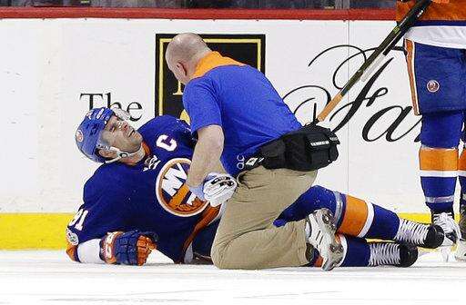 A trainer checks on New York Islanders' John Tavares after he was injured during the third period of an NHL hockey game against the New Jersey Devils Friday, March 31, 2017, in New York. The Islanders won 2-1. (AP Photo/Frank Franklin II) The Associated Press