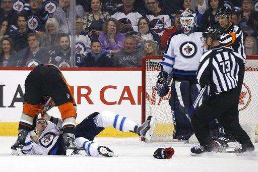 Winnipeg scored twice in the final 8:25 of the third period to pull even. Following a coach's challenge by Randy Carlyle of the Ducks, it was determined that Byfuglien's jam job in the crease was indeed a good goal.
