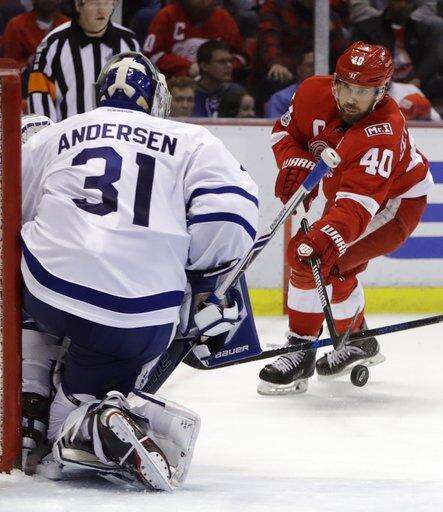 Detroit Red Wings left wing Henrik Zetterberg (40) shoots toward Toronto Maple Leafs goalie Frederik Andersen (31) during the second period of an NHL hockey game, Saturday, April 1, 2017, in Detroit. (AP Photo/Carlos Osorio) The Associated Press