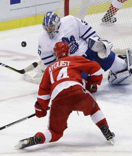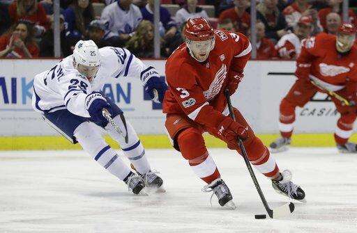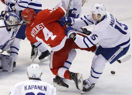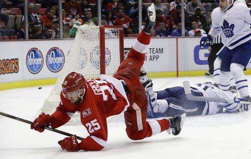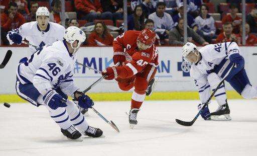 NOTES: Detroit F Anthony Mantha (broken finger) and F Luke Glendening (broken ankle) are both done for the season. ... The Maple Leafs last swept the season series from the Red Wings in 2011-12, taking a 4-3 decision in the only meeting between the teams. ... Leafs F Zach Hyman has set a franchise rookie record with four short-handed goals. ... Several members of the Leafs staff skated on the JLA ice after Saturday's morning skates, including team president and former Wings forward Brendan Shanahan, who participated wearing a pair of skates he borrowed from Leafs coach Mike Babcock. ... Struck in the face by the stick of Toronto's Connor Carrick in the second period, Detroit F Andreas Athanasiou took stitches to the lip and returned for the third period wearing a full facemask.