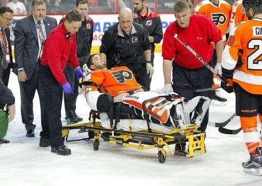 Neuvirth left the game after collapsing in his crease 7 1/2 minutes into the game. He was carted off the ice on a stretch and later taken to Pennsylvania Hospital, where he was "awake and alert," according to Flyers general manager Ron Hextall. Neuvirth stopped all six shots he faced.