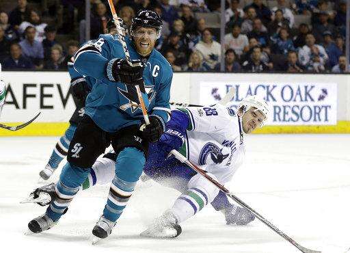 San Jose Sharks' Joe Pavelski, left, works against Vancouver Canucks defenseman Nikita Tryamkin (88) during the second period of an NHL hockey game Tuesday, April 4, 2017, in San Jose, Calif. (AP Photo/Marcio Jose Sanchez) The Associated Press