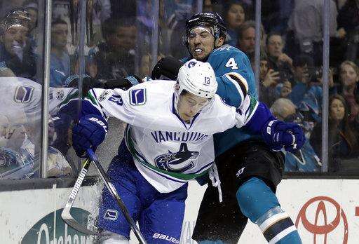Vancouver Canucks' Griffen Molino (13) collides with San Jose Sharks defenseman Brenden Dillon (4) during the first period of an NHL hockey game Tuesday, April 4, 2017, in San Jose, Calif. (AP Photo/Marcio Jose Sanchez) The Associated Press