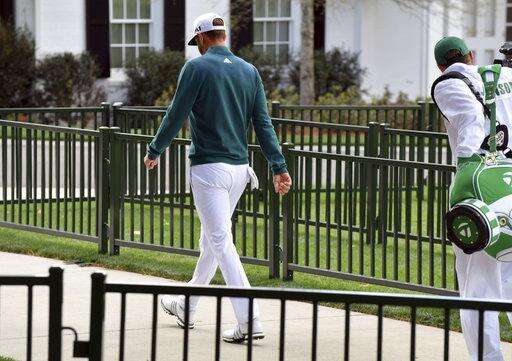 Dustin Johnson walks off the 1st tee after deciding not to play in the opening round of the Masters golf tournament at the Augusta National Golf Club in Augusta, Ga., Thursday, April 6, 2017. The world's No. 1-ranked player was, however, forced to withdraw from the Masters on Thursday because of a lower back injury suffered less than 24 hours earlier in a freak fall at the home he was renting for the week. (Brant Sanderlin/Atlanta Journal-Constitution via AP) The Associated Press