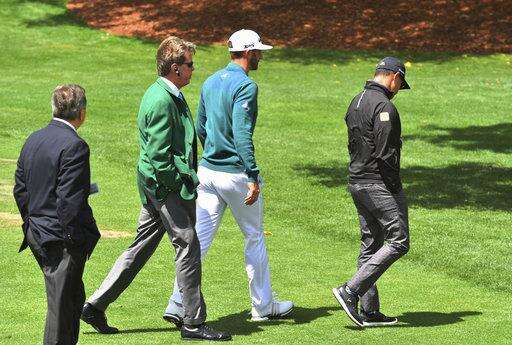 Dustin Johnson, center, walks off the 1st tee after deciding not to play in the opening round of the Masters golf tournament at the Augusta National Golf Club in Augusta, Ga., Thursday, April 6, 2017. The world's No. 1-ranked player was, however, forced to withdraw from the Masters on Thursday because of a lower back injury suffered less than 24 hours earlier in a freak fall at the home he was renting for the week. (Brant Sanderlin/Atlanta Journal-Constitution via AP) The Associated Press