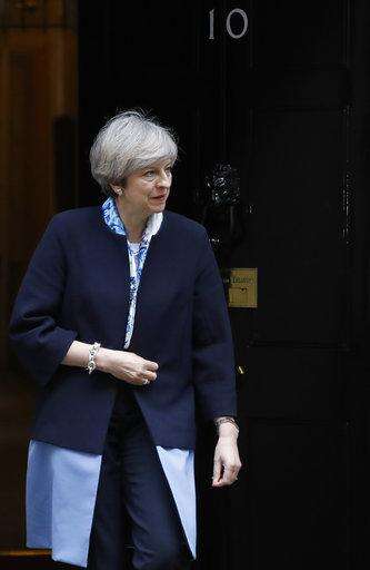 Britain's Prime Minister Theresa May walks out of 10 Downing Street to greet Donald Tusk, President of the EU Council, ahead of a meeting, in London, Thursday, April 6, 2017. (AP Photo/Frank Augstein) The Associated Press
