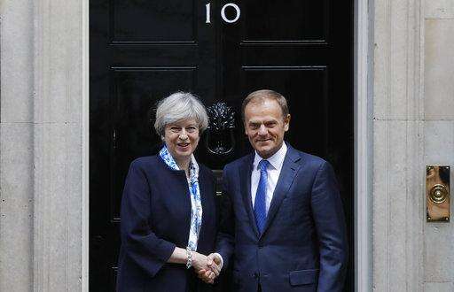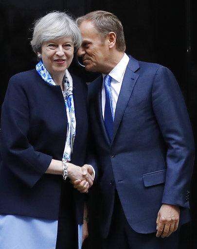 LONDON (AP) - European Council President Donald Tusk and British Prime Minister Theresa May met Thursday to seek a smooth start to the U.K.'s EU departure, a day after the European Parliament laid out tough guidelines for the divorce negotiations.