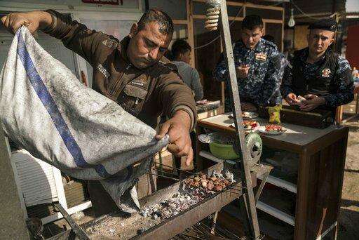 HAMDANIYA, Iraq (AP) - Bahaa Franshaw spikes pieces of meat onto a skewer on a recent day, ready to sell to the passing trade. His potential customers include civilians coming through Hamdaniya from Mosul to escape the fighting there. Heading toward Mosul are military reinforcements and non-governmental organization workers trying to help get the war-torn city back on its feet.