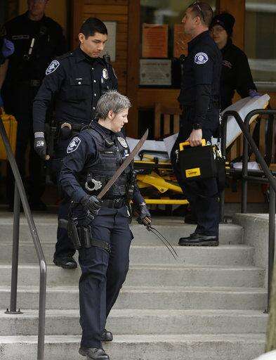 In this photo taken March 2, 2016, a Seattle Police officer carries knives out of an apartment building in Seattle after officers, including several members of SPD's crisis response unit, were able to peacefully take the owner of the knives into custody after he had barricaded himself inside his apartment. A new report from a court-appointed monitor released Thursday, April 6, 2017, says that the use of serious levels of force by Seattle police is down 60 percent since the federal government imposed reforms on the department. (AP Photo/Ted S. Warren) The Associated Press