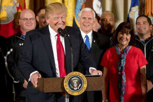 President Donald Trump, accompanied by Vice President Mike Pence his wife Karen, right, and others, smiles while speaking at a Wounded Warrior Project Soldier Ride event in the East Room of the White House in Washington Thursday, April 6, 2017. (AP Photo/Andrew Harnik) The Associated Press