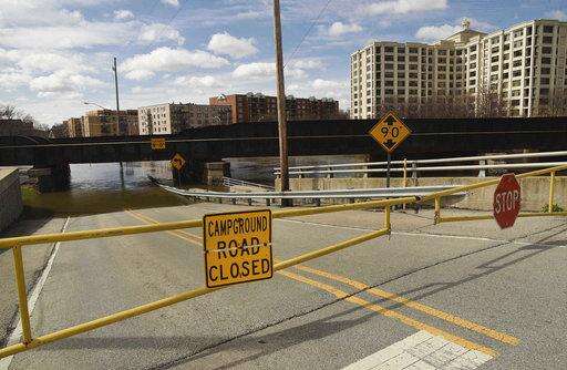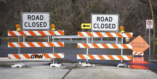 McClure Avenue in Gurnee, Ill., is closed at the entrance to the parking lot for Gowe Park due to recent rains that have resulted in flooding, Thursday, April 6, 2017. (Paul Valade/Daily Herald via AP)