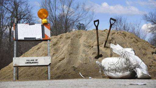 Sand and sand bags are available to Lincolnshire residents at Spring Lake Park as recent rain has resulted in flooding, Thursday, April 6, 2017 in Lincolnshire, Ill. The rising Des Plaines River is beginning to flood some areas as well. (Paul Valade/Daily Herald via AP)
