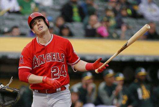 Adam Rosales scored from first when Marcus Semien's routine single to center deflected off Mike Trout's glove and rolled to the wall for an error. Khris Davis hit a sacrifice fly and Healy hit a two-run homer with two outs that landed halfway up the bleachers in left.