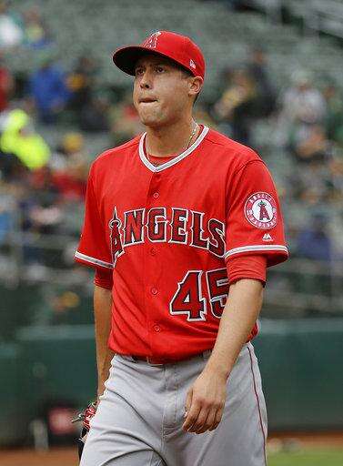 Los Angeles Angels starting pitcher Tyler Skaggs walks back to the dugout after throwing in the third inning of a baseball game against the Oakland Athletics on Thursday, April 6, 2017, in Oakland, Calif. (AP Photo/Eric Risberg) The Associated Press