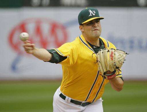 Oakland Athletics starting pitcher Andrew Triggs throws in the first inning of a baseball game against the Los Angeles Angels on Thursday, April 6, 2017, in Oakland, Calif. (AP Photo/Eric Rosberg) The Associated Press