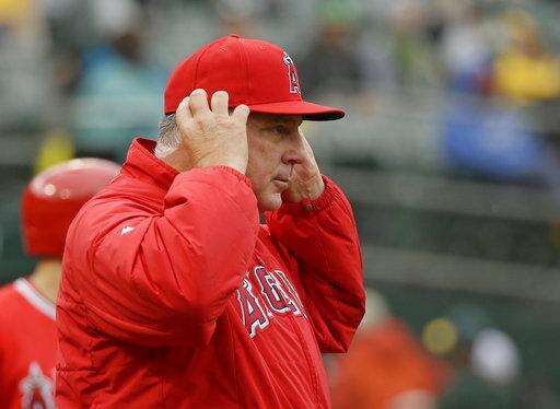 Los Angeles Angels manager Mike Scioscia motions for a replay review after Angels' Ben Revere was called out at second base during the sixth inning of the team's baseball game against the Oakland Athletics Thursday, April 6, 2017, in Oakland, Calif. The call was upheld. (AP Photo/Eric Risberg) The Associated Press
