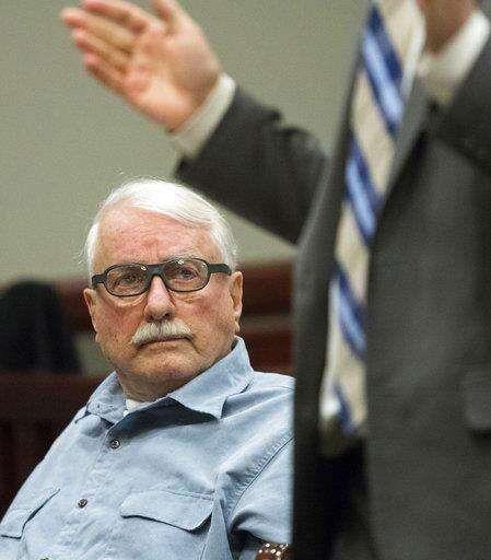 Jack McCullough looks to his attorney Russell Ainsworth of the Exoneration Project Thursday, April 6, 2017, at the DeKalb County Courthouse in Sycamore, Ill. McCullough, a retired Washington state police officer, who a prosecutor says was wrongly convicted in the 1957 killing of a 7-year-old Illinois girl is seeking a certificate of innocence. (Matthew Apgar/Daily Chronicle via AP, Pool) The Associated Press