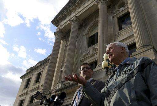Jack McCullough issues a statement to the media with his attorney Russell Ainsworth of the Exoneration Project, left, Thursday, April 6, 2017, at the DeKalb County Courthouse in Sycamore, Ill. McCullough is seeking a certificate of innocence in the 1957 murder of Maria Ridulph. (Matthew Apgar/Daily Chronicle via AP, Pool) The Associated Press