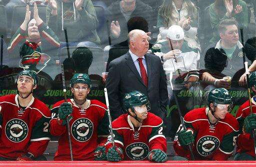 FILE - In this Feb. 18, 2017 file photo Minnesota Wild head coach Bruce Boudreau watches his NHL hockey team play against the Nashville Predators in St. Paul, Minn. Boudreau is back in the playoffs with a third team, the Minnesota Wild in his debut season. For the eighth time in this unique character of a coach's nine postseason appearances, his team has one of the top two records in its conference. (AP Photo/Jim Mone,File) The Associated Press