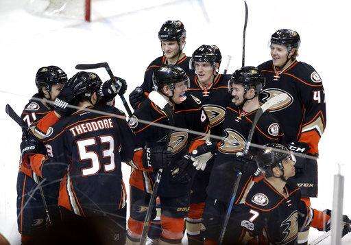 Anaheim Ducks players celebrate their team's 4-3 overtime win against the Los Angeles Kings in an NHL hockey game Sunday, April 9, 2017, in Anaheim, Calif. (AP Photo/Jae C. Hong) The Associated Press
