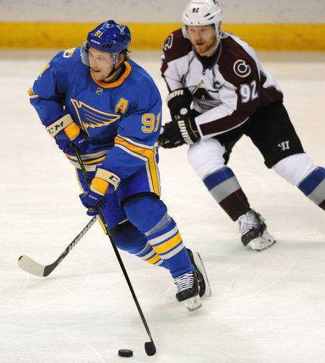 St. Louis Blues' Vladimir Tarasenko (91), of Russia, skates by Colorado Avalanche's Gabriel Landeskog (92), of Sweden, during the third period of an NHL hockey game, Sunday, April 9, 2017, in St. Louis. The Blues won 3-2. (AP Photo/Bill Boyce) The Associated Press