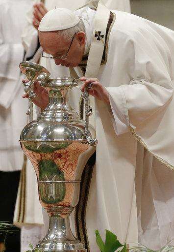 VATICAN CITY (AP) - Pope Francis washed the feet of a dozen inmates at a maximum security prison on Holy Thursday in a pre-Easter ritual meant to show his willingness to serve society's most marginal and give them hope. Francis urged the prisoners to help one another out and similarly "be the servant of others."