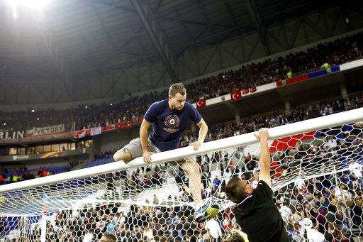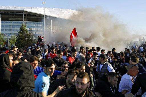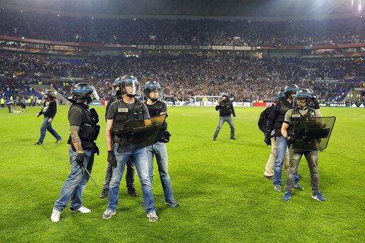 GENEVA (AP) - On a volatile night in Lyon, fighting French and Turkish fans delayed a Europa League quarterfinal kickoff by 45 minutes on Thursday.