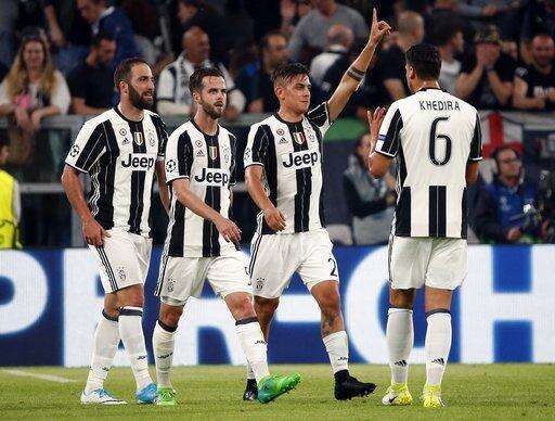 Juventus's Paulo Dybala, second from right, celebrates after scoring his side's second goal during a Champions League, quarterfinal, first-leg soccer match between Juventus and Barcelona, at the Juventus Stadium in Turin, Italy, Tuesday, April 11, 2017. (AP Photo/Antonio Calanni) The Associated Press