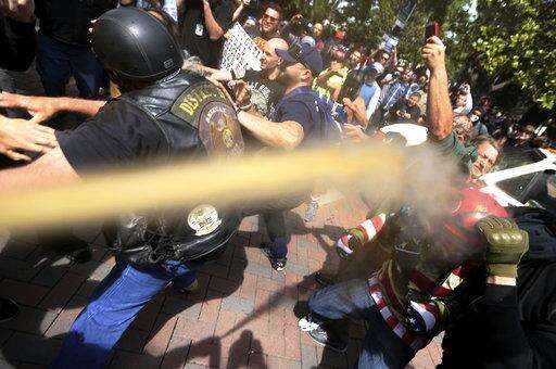 Pepper spray is used as anti and pro-Donald Trump protesters clash during competing demonstrations at Martin Luther King Jr. Civic Center Park in Berkeley, Calif., Saturday, April 15, 2017. Protesters took to the streets in dozens of cities nationwide, many calling on Trump to release his tax returns. (Anda Chu/San Jose Mercury News via AP)