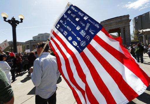 A protester holds on to a different version of the American flag during a rally and march in downtown Denver Saturday, April 15, 2017. The rally in Denver was one of dozens in cities nationwide to call on President Donald Trump to release his tax returns, saying Americans deserve to know about his business ties and potential conflicts of interest. (AP Photo/David Zalubowski)