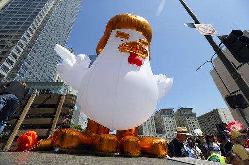A giant inflatable "Chicken Don" is set up by demonstrators protesting President Donald Trump's failure to release his tax returns and a host of other issues during a march and rally in downtown Los Angeles Saturday, April 15, 2017. (AP Photo/Reed Saxon)