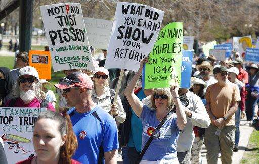 Protesters carry placards during a rally and march in downtown Denver Saturday, April 15, 2017. The rally in Denver was one of dozens in cities nationwide to call on President Donald Trump to release his tax returns, saying Americans deserve to know about his business ties and potential conflicts of interest. (AP Photo/David Zalubowski)