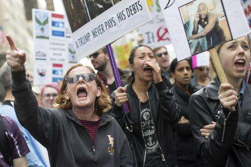 Demonstrators chant "shame" as they march past Trump Tower during rally to demand President Donald Trump release his tax returns, Saturday, April 15, 2017, in New York. Protesters took to the streets in dozens of cities nationwide Saturday to call on Trump to release his tax returns, saying Americans deserve to know about his business ties and potential conflicts of interest. (AP Photo/Mary Altaffer)