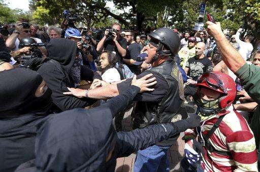 Anti and pro-Donald Trump supporters clash during competing demonstrations at Martin Luther King Jr. Civic Center Park in Berkeley, Calif., Saturday, April 15, 2017. Protesters took to the streets in dozens of cities nationwide, many calling on Trump to release his tax returns. (Anda Chu/San Jose Mercury News via AP)